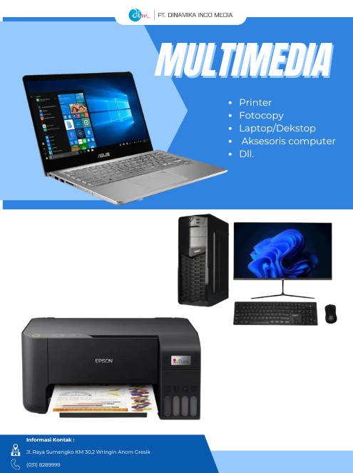 Perangkat multimedia meliputi laptop, desktop (komputer meja), printer, scanner, mesin fotocopy, speaker, microphone, kamera atau webcam, headset, flashdisk, harddisk eksternal, serta berbagai aksesoris komputer seperti mouse, keyboard, dan monitor.